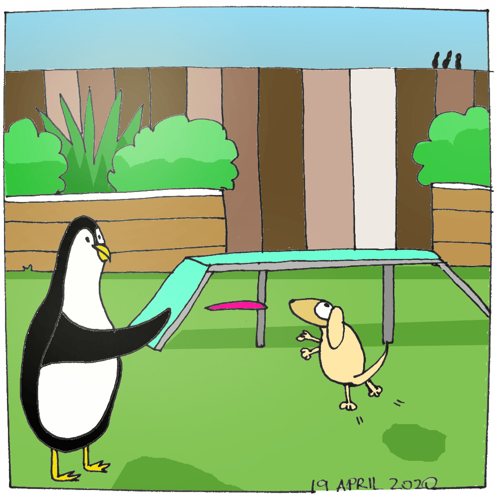 In today’s Adventures of Arthur Puddles we find him playing with Douglas dog in the backyard to celebrate Canine Fitness Month. Arthur bought Douglas some fun obstacle course items and a frisbee. Douglas had a lot of fun and a lot of exercise.